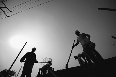 7月5日,山東濟南烈日當空,在共青團路附近一處建筑工地,農(nóng)民工依然堅守崗位。